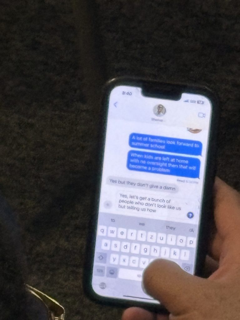 The text message was exchanged at a March 12, 2025 Council meeting where the superintendent presented the board of education’s budget that eliminated summer school. Former Councilor Kirton texted to Mahon that ‘a lot of families look forward to summer school’. Kirton went on to say ‘when kids are left at home with no oversight that will become a problem’. Mahon responded ‘yes but they don’t give a damn’. Kirton went on to say, ‘yes let’s get a bunch of people that don’t look like us but telling us how”.