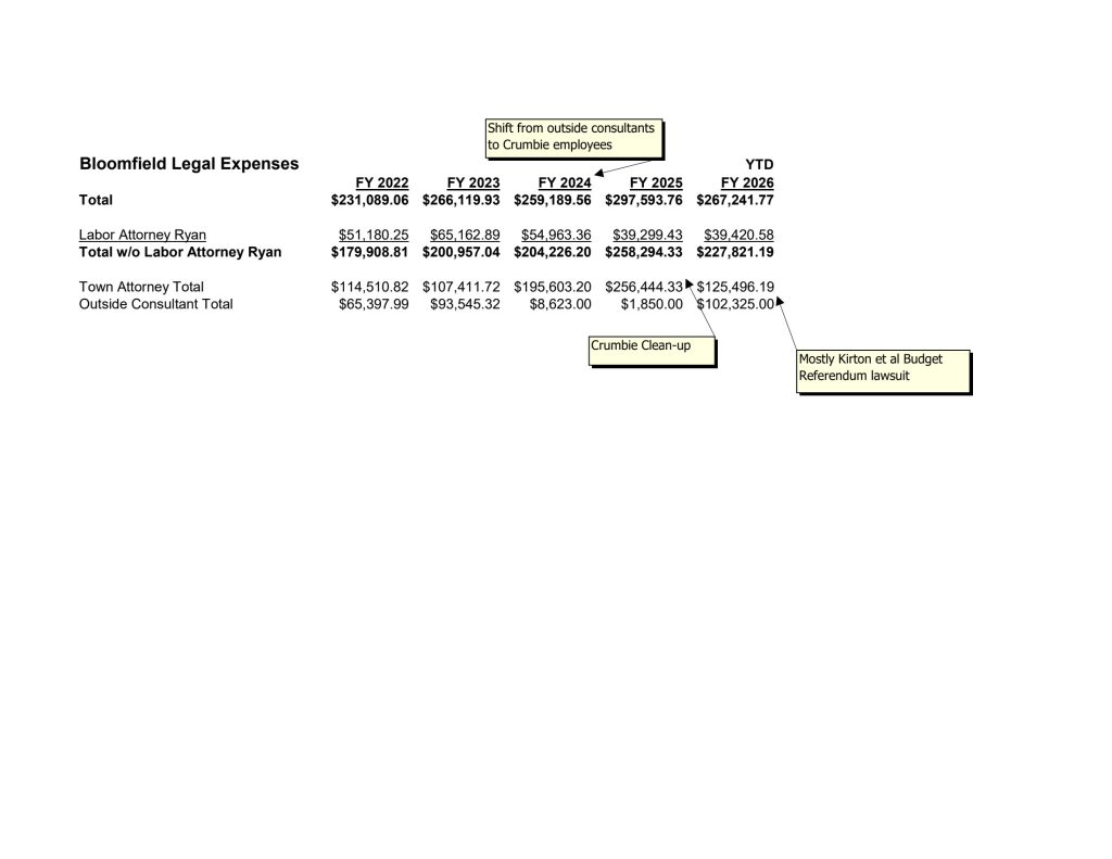 - Before FY 2024, most of Bloomfield’s legal work was outsourced under the prior Town Attorney. With Attorney Crumbie’s broader legal operation, much of that work was brought back in-house, saving on outside consultant fees. Unlike the former town attorney, who essentially was a one-person operation, the current town attorney has a full-service law firm and dedicates 3-4 attorneys to handling Bloomfield work at reduced rates.